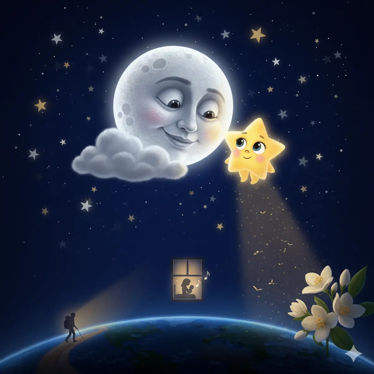 A Sábia Lua, redonda e prateada como uma moeda mágica, ouviu o lamento da pequena. Ela desceu deslizando pelas nuvens fofas e sussurrou no ouvido de Biancacom voz de mãe: