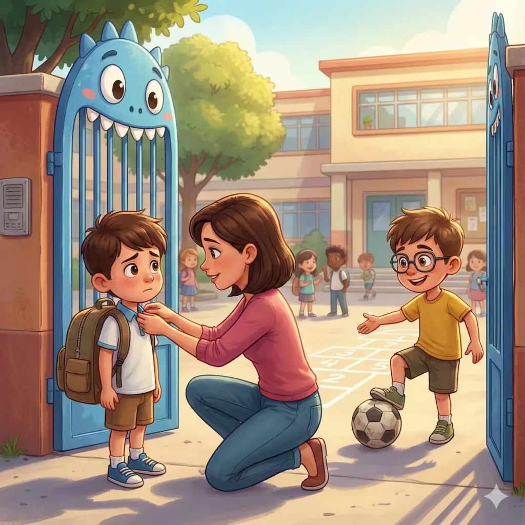 O portão azul da escola parecia a boca de um monstro gigante prestes a engolir as crianças. Pelo menos, era