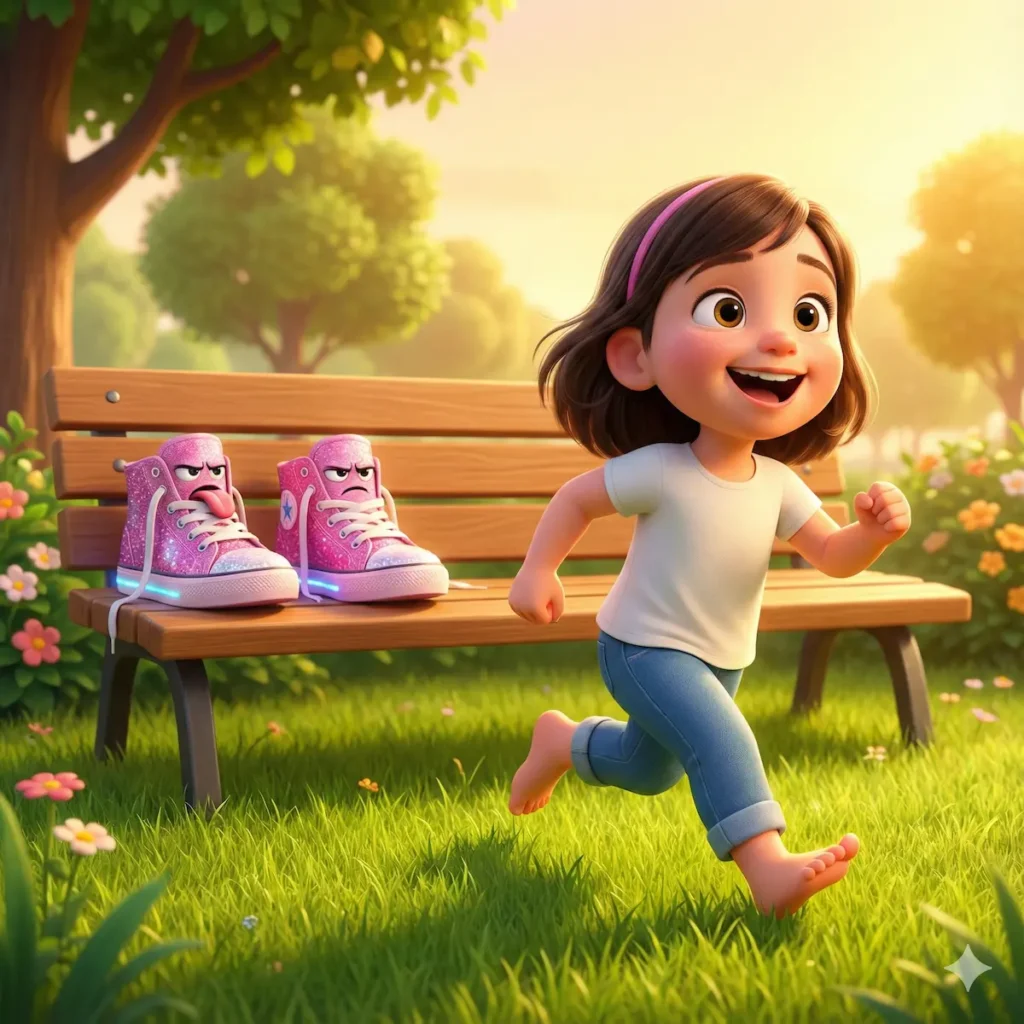 Catarina calçou o tênis novo. Ele era rosa, brilhante e tinha luzinha no calcanhar que piscava quando ela pisava. Mas,