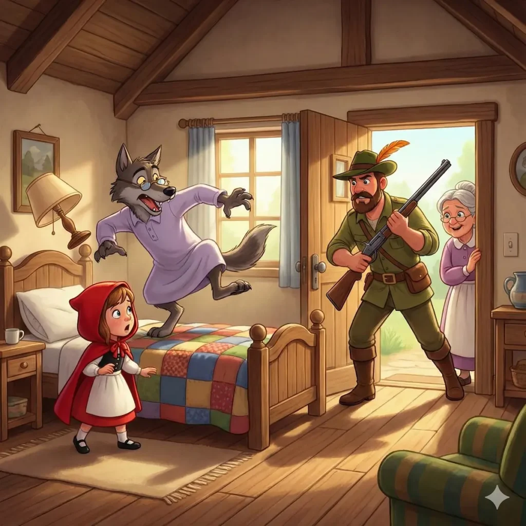 O Lobo saltou da cama, derrubando o abajur. Chapeuzinho gritou, correndo pela sala, mas o Lobo era rápido.