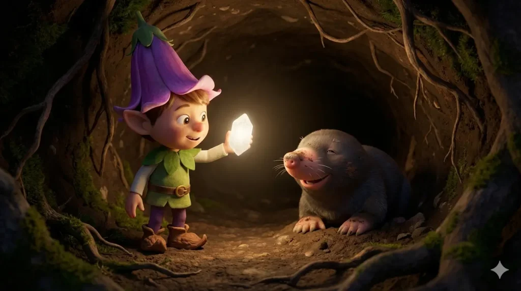 A luz branca iluminou o túnel. A toupeira piscou seus olhinhos sensíveis. — Oh… parece um pedacinho da lua — disse ela, sorrindo. — Obrigada, amigo. Agora consigo ver o caminho de volta para minha família.