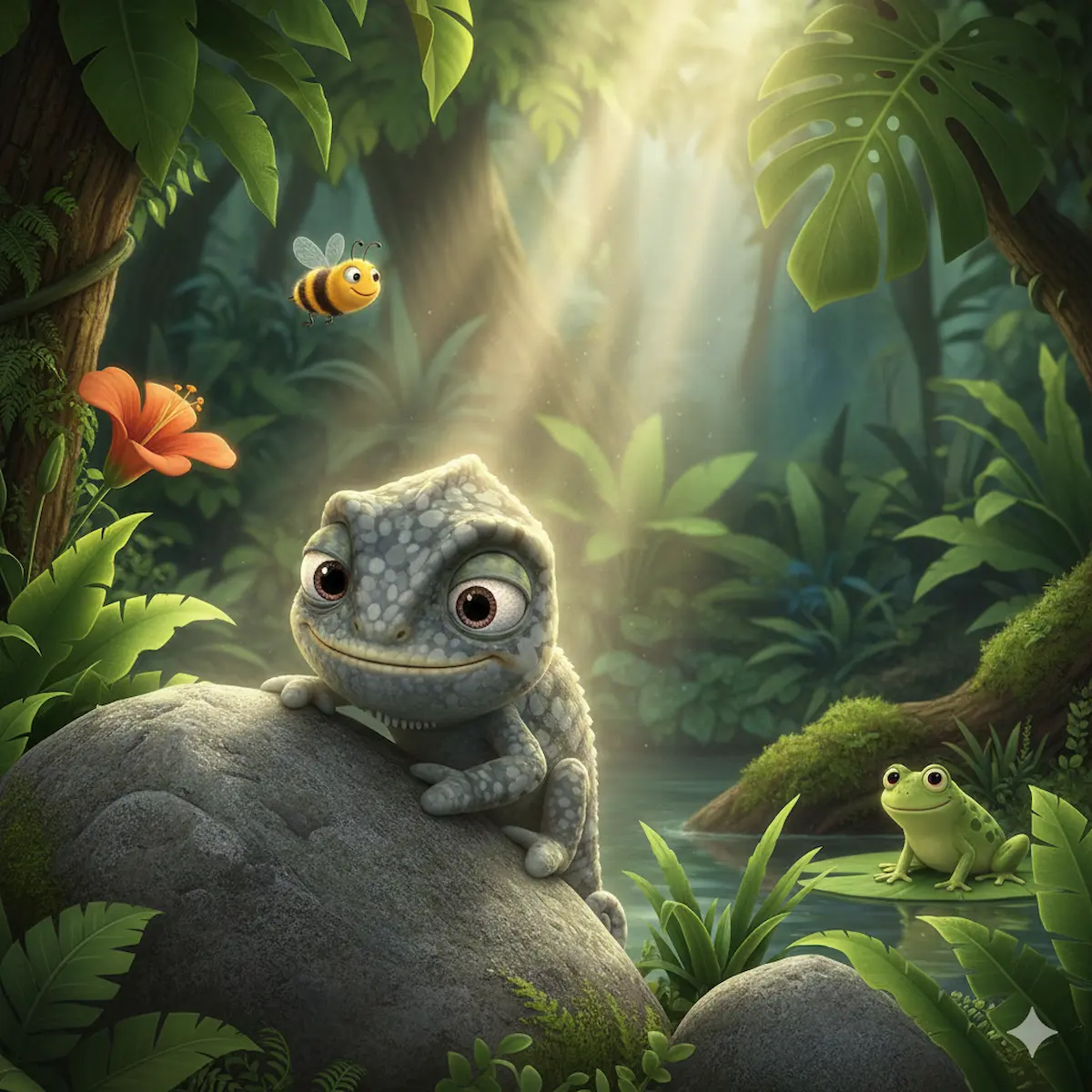Gael, o pequeno camaleão, suspirou. O suspiro saiu triste e longo. Toda vez que ele ficava nervoso, suas cores faziam uma bagunça. Se queria ficar marrom como o tronco, ficava azul-turquesa. Se queria ficar amarelo como o sol, virava roxo.