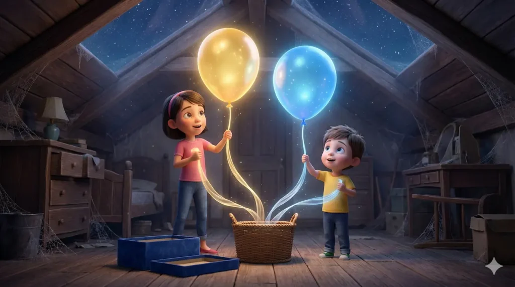 No fundo do sótão, debaixo de um lençol velho, eles encontraram. Não era um baú de ouro, mas uma caixa de sapatos forrada com veludo azul. Dentro, não havia joias, apenas um pacote de balões. Mas não eram balões comuns. Eles eram prateados, frios ao toque e pareciam feitos de luz líquida.