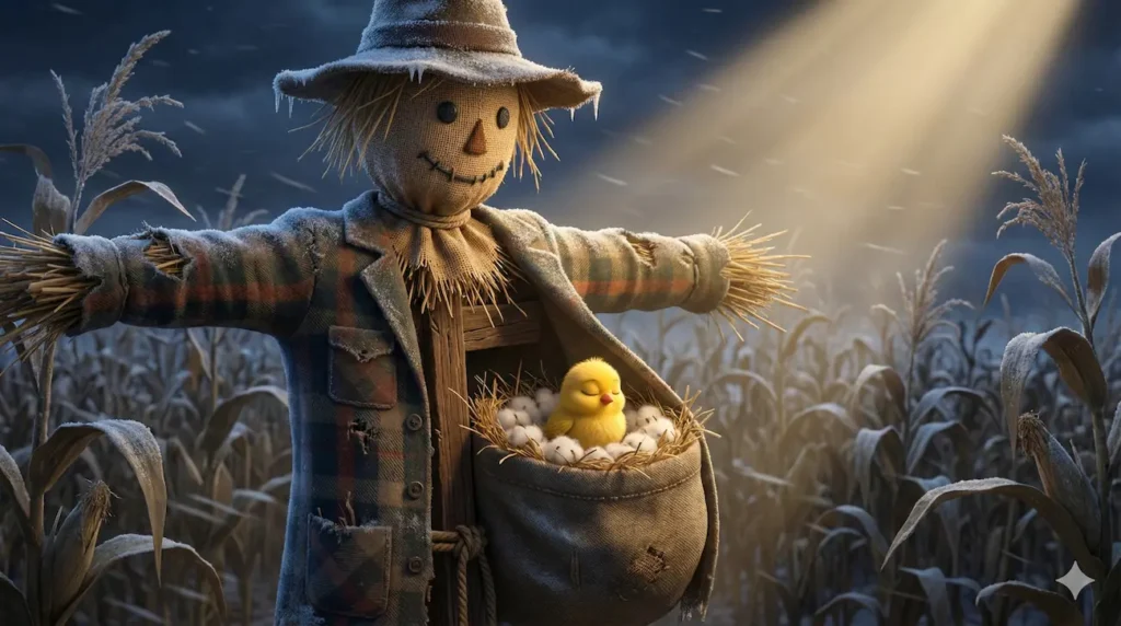 Palha não podia sorrir, pois sua boca era costurada, mas por dentro, sua palha brilhou de alegria. Ele descobriu que não precisava deixar de ser espantalho para ser amado; ele só precisava transformar seus braços, que antes serviam para espantar, em um abrigo seguro para proteger.