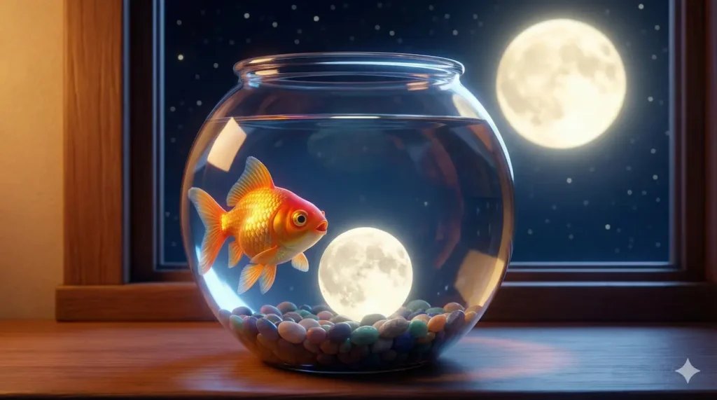 Ele não se sentiu mais sozinho. Ele começou a nadar em círculos ao redor do reflexo da Lua, dançando uma valsa silenciosa de ouro e prata. Ele aprendeu que, mesmo preso num aquário pequeno, se a água estiver calma e o coração estiver aberto, o universo inteiro pode caber dentro da nossa casa.