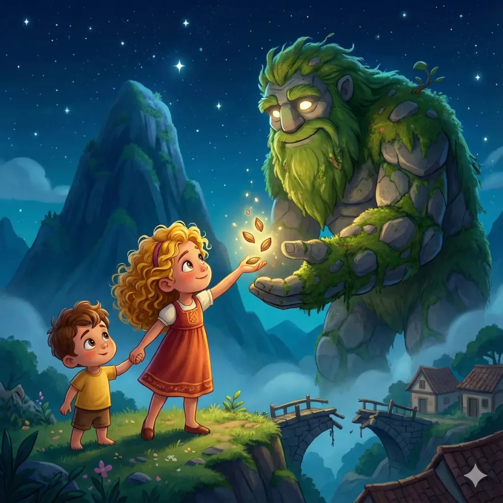 Lá no alto, onde o ar era rarefeito e o silêncio era absoluto, uma sombra gigante se ergueu. Era o Guardião. Ele era feito de rocha e musgo, e sua voz parecia um trovão distante.
